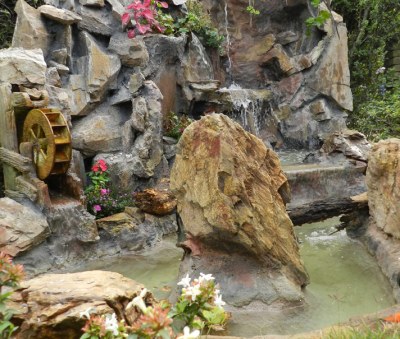 Cascada, molino de agua, plantas, rocas