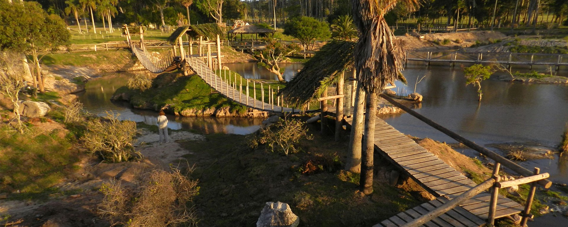 Tres pérgolas como bases para sostener dos puentes colgantes.